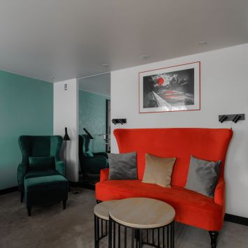 ПарковкаДвухкомнатный номер категории люкс подходит для отдыха всей семьей или для деловых поездок. Нам удалось вписать в классический дизайн элементы стиля лофт: кофейные столики, просторная гардеробная с металлическим каркасом красиво сочетаются с мягкими цветными креслами, большим оранжевым диваном.
